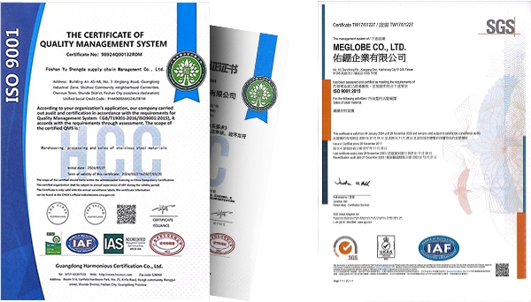 At MEGLOBE, we are dedicated to delivering the highest quality stainless steel products. Our unwavering commitment to excellence is demonstrated by our achievement of mutiple intemational certions. Notably, we have eamed ISO quality management system cerffication, We take pride in our rigorous quality assurance processss,which reffect our dedication to excellence in every aspect of our operations.which guarantees that our products and services consistently meet and exceed global standards.